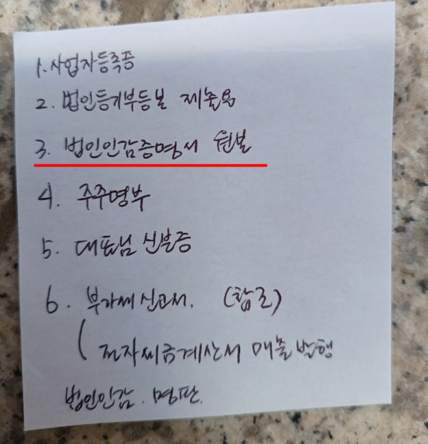 마침내 시간을 내어 법인카드를 개설하기로 했고, 은행에 필요한 서류를 물어보니 여러가지 구비해야 할 서류를 알려주었습니다. 바로 아래와 같은데요.
