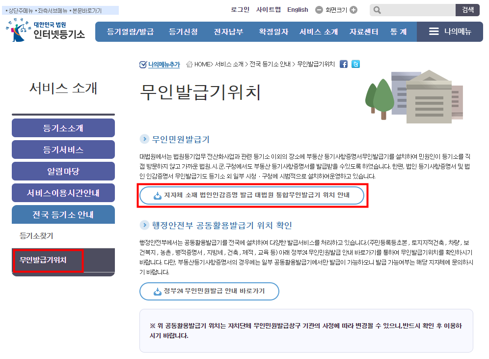 이렇게 무인발급기 위치를 확인할 수 있는데요. 대법원에서는 법원등기업무 전산화를 위해 각 등기소에 등기사항증명서 무인발급기를 설치해 운영중에 있습니다. 웬만한 법원, 시/군/구청에서 발급이 가능하지만 혹시 모르니 반드시 방문전 체크해보고 가는 것이 좋습니다.