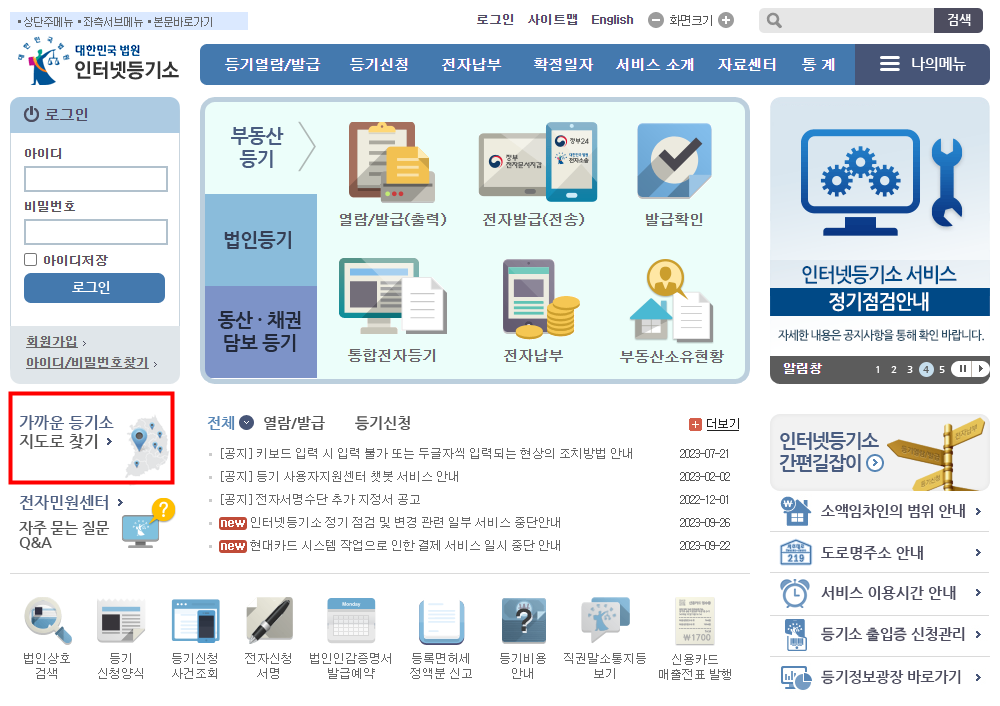 인터넷등기소 사이트 메인 화면에 좌측을 보면 "가까운 등기소 지도로 찾기" 라는 배너가 보일겁니다.