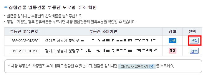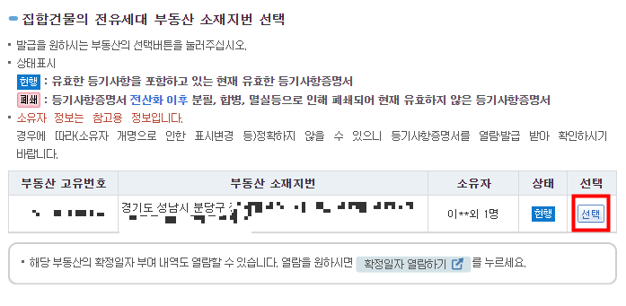 그러면 소유자정보가 나오는데, 제가 조회한 부동산은 소유자가 2명으로 되어 있네요. 아마도 공동명의가 아닐까 싶습니다. 이제 다시한번 [선택] 버튼을 클릭합니다.