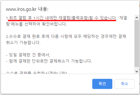 이 때 최초 열람 후 1시간 내에만 재열람 및 출력이 가능하니 이점 참고하시길 바랍니다.
