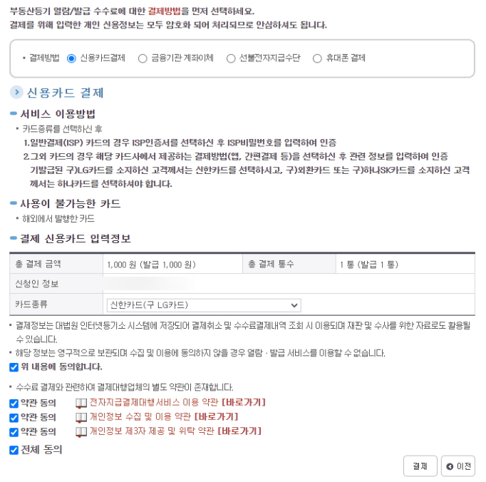 저는 발급을 선택했고, [결제] 버튼을 클릭해 결제단계로 진입합니다.