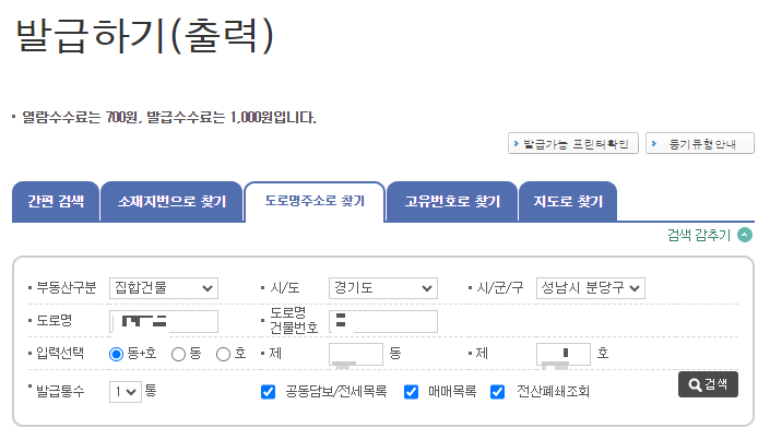 대상 부동산의 주소지는 지번, 도로명, 고유번호, 지도 등으로 검색 가능합니다. 저는 요새 많이 쓰는 도로명주소로 찾기로 진행해보았습니다.