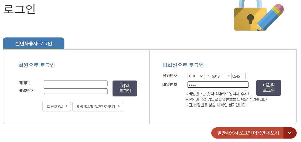 결제를 위해서는 일단 로그인 하라는 화면이 나오는데, 꼭 로그인하지 않아도 비회원으로도 진행 가능합니다. 비회원으로 하는 경우는 전화번호와 4자리 비밀번호를 설정합니다.