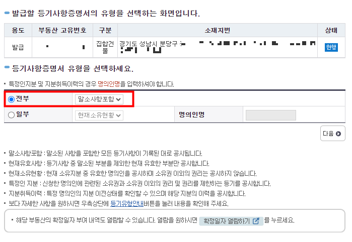 그리고 등기사항증명서 유형을 선택해야 하는데, 가급적 '전부'를 선택하고, '말소사항포함'으로 진행해봅니다.