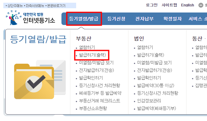 인터넷등기소 홈페이지 상단 메뉴에서 '등기열람/발급 > 부동산 > 발급하기(출력)' 메뉴를 클릭합니다.