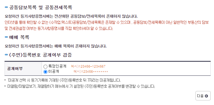소유자를 비롯해 특정인에 해당하는 경우 주민등록번호가 공개된 상태로 확인할 수 있지만 저는 아직 3자이므로 주민등록번호를 미공개로 발급을 시도해봅니다. 미공개 선택시 주민번호 뒤 7자리는 마스킹 되어 표기됩니다.