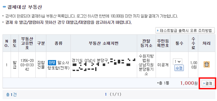 마지막으로 약관 동의를 마친후 [결제] 버튼을 한번 더 클릭하면 최종적으로 등기부등본 열람 및 발급이 됩니다.