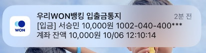 입금과 동시에 내 계좌에 만원이 입금됐다는걸 앱에서 알림으로 알려줍니다.
