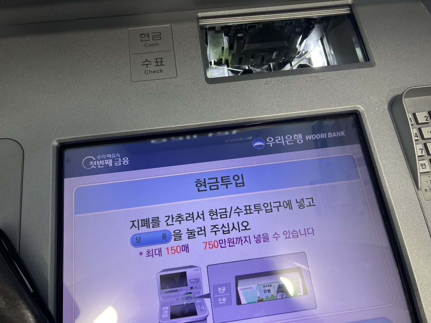 여기에 입금하고자 하는 현금을 집어넣습니다. 저는 1만원권 지폐 한장을 넣어보았습니다. 뭔가 달랑 지폐 한장만 넣으니 허전한 느낌이긴 하네요.