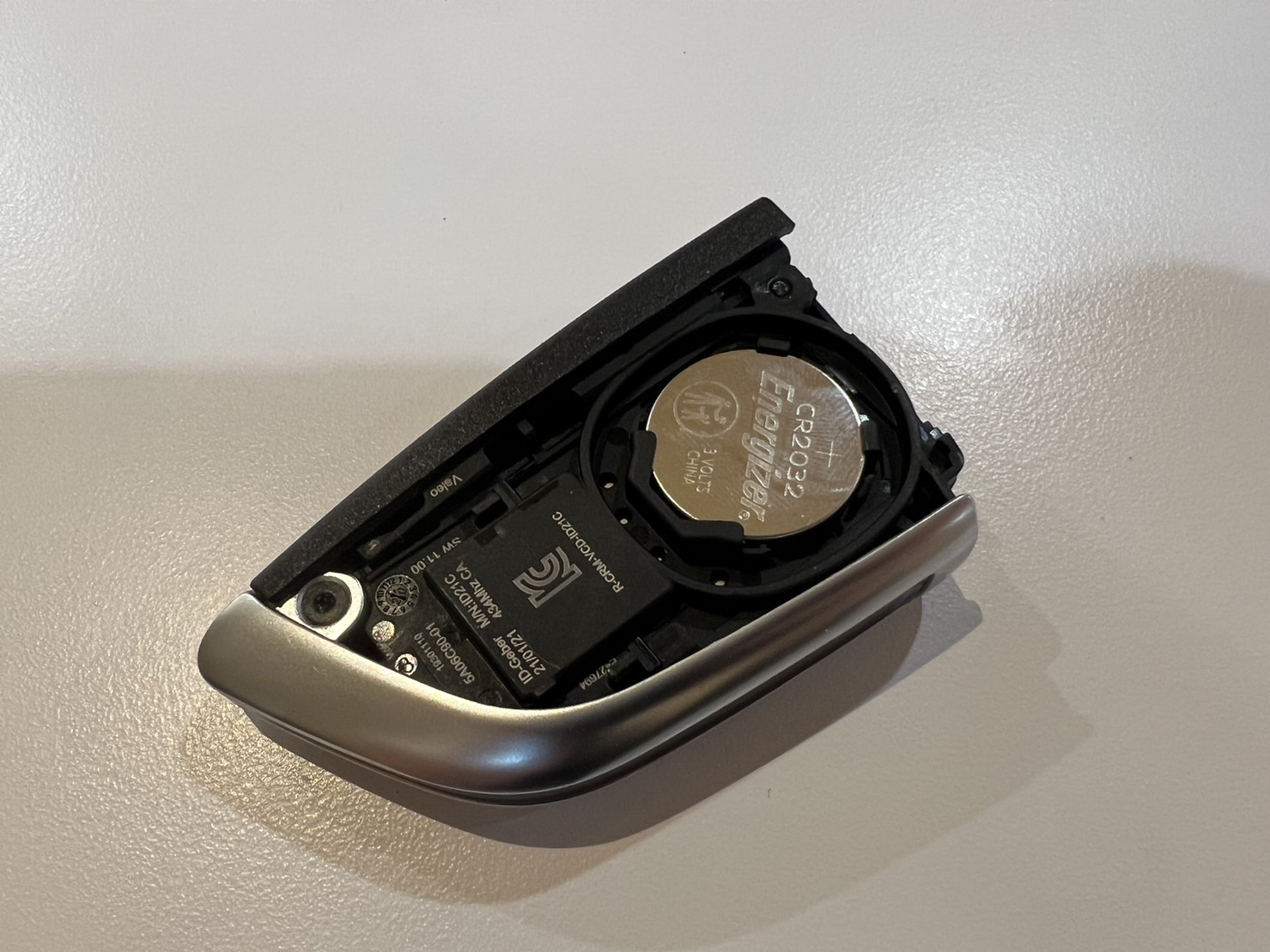 그렇게 스마트키 뒷면이 열리면 그 안에 동그란 은색 물체가 보입니다.