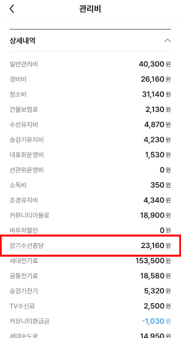 즉, 우리가 거주하면서 내는 관리비에서 매달 일정 금액을 떼어 적립식으로 따로 쌓아두는 개념이지요. 관리비 내역서를 자세히 보시면 '장기수선충당금' 이라는 항목이 있습니다.