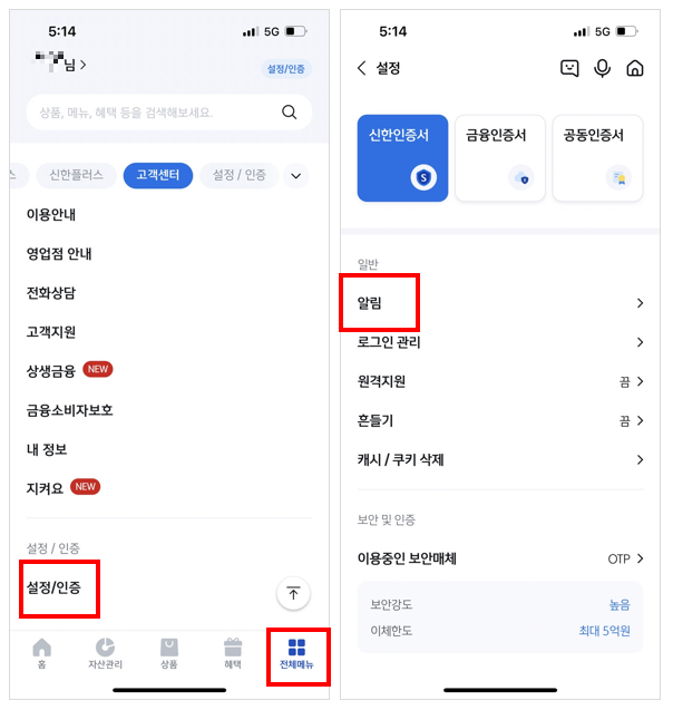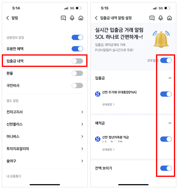 신한은행 Sol 앱에서 입출금 알림 설정하는 방법