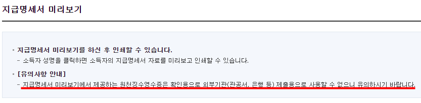그리고 뜨는 팝업 화면에서 원천징수영수증을 확인할 수 있고, 바로 출력도 할 수 있습니다.