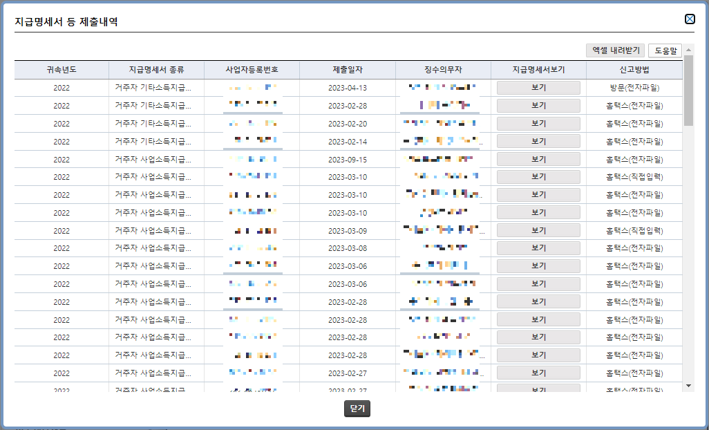 그러면 아래와 같이 팝업이 뜨면서 원천징수 한 소득 내역이 쭉 나열됩니다.