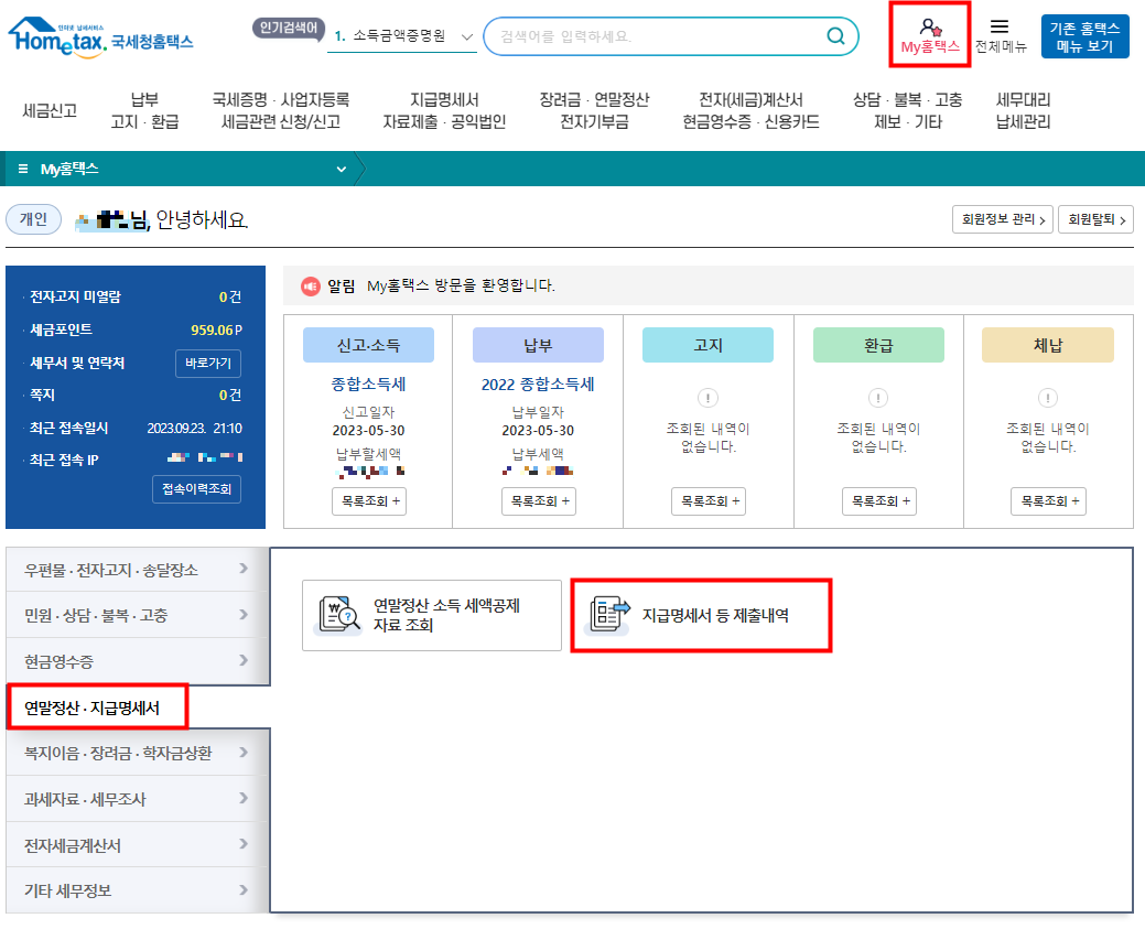 홈택스에 접속해 로그인을 한 후 아래 화면처럼 "My홈택스 > 연말정산/지급명세서 > 지급명세서 등 제출내역" 메뉴로 접근하면 됩니다.