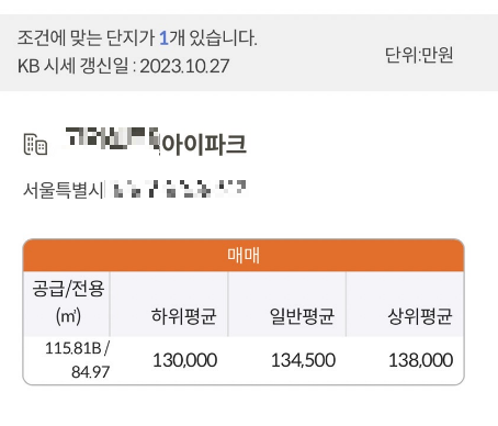 KB시세는 하위평균, 일반평균, 상위평균으로 나뉘어져 있는데 가장 일반적인 것은 '일반평균'입니다. 하지만 대출 한도를 정할 때 일부 은행에서는 가격 책정을 보수적으로 하기 위해 '하위평균'을 기준으로 잡는 경우들도 있습니다. 위에서 조회한 아파트의 경우 하위평균은 13억이고, 일반평균은 13억4500만원 그리고 상위평균은 13억8천만원임을 알 수 있습니다.