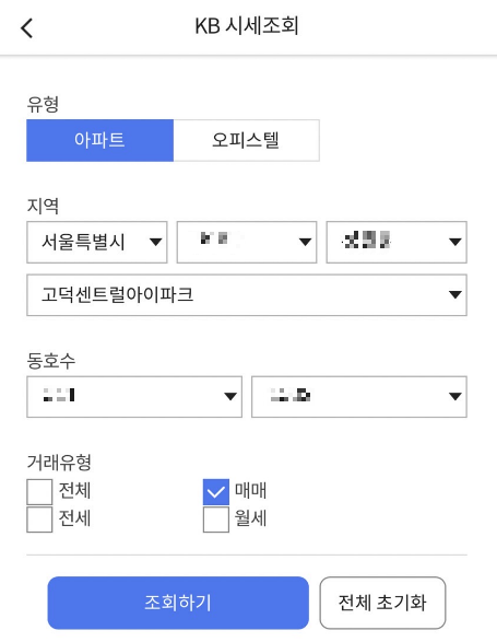 먼저 KB시세조회를 위해 부동산의 유형, 지역, 동호수, 거래유형을 선택하는데요.
