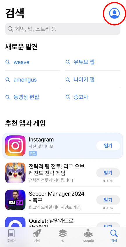 먼저 iOS 앱스토어를 실행하고 첫화면에서 우측 상단에 사람 아이콘을 클릭합니다.