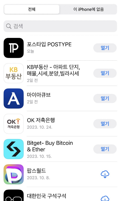 그러면 내가 그동안 다운 받았던 모든 앱들이 쭉 나열됩니다.