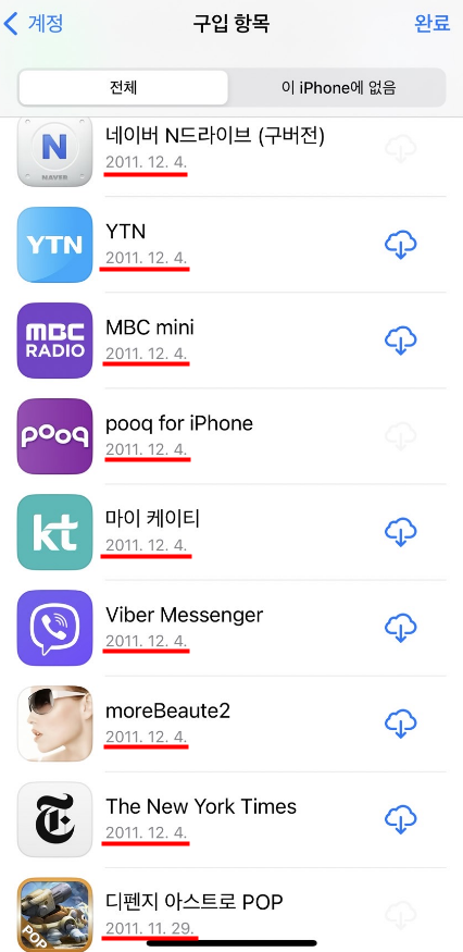 10여년전 구입한 앱 목록까지 버젓이 나오고 있는걸 보면 잠깐 20대 때의 추억이 생각나는 것 같습니다.