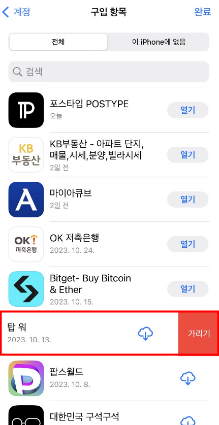 이 가리기 버튼을 누르면 해당 앱은 구매항목에서 즉시 삭제가 됩니다.