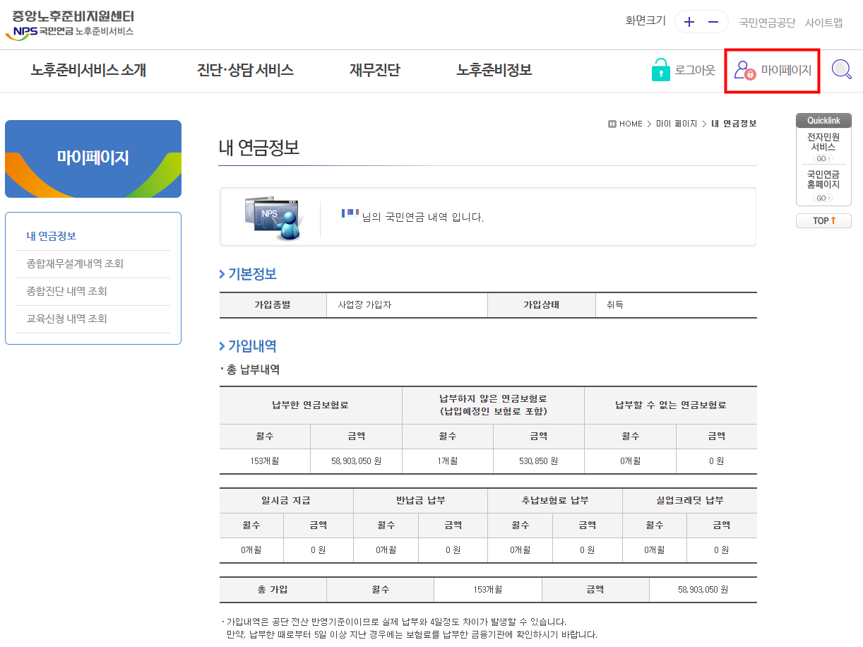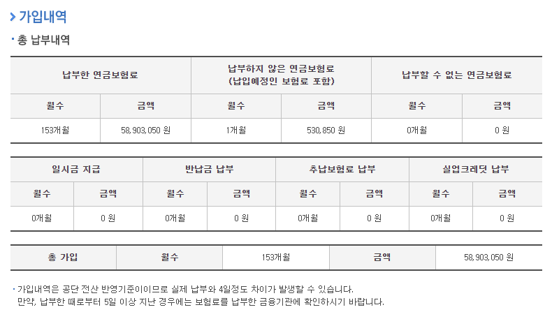 아래 화면은 저의 사례인데, 저는 그동안 총 153개월간 납부한 것을 알 수 있습니다. 그리고 그 기간동안 납부한 금액은 5,890만원 정도 되고 최근 월 납부액은 약 53만원입니다.