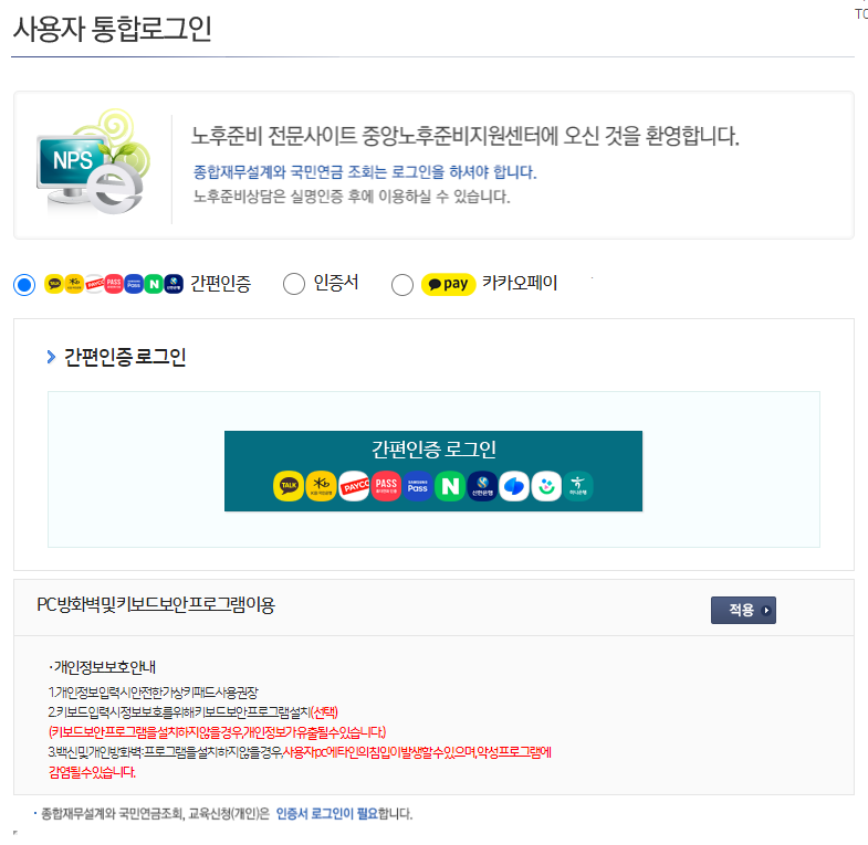 각종 인증서를 통해 로그인을 할 수 있는데, 네이버나 카카오, PASS 등 간편인증을 하면 쉽게 로그인 할 수 있습니다. 시중에 거의 모든 인증수단을 제공하고 있어서 아마 큰 어려움은 없으실듯 합니다.
