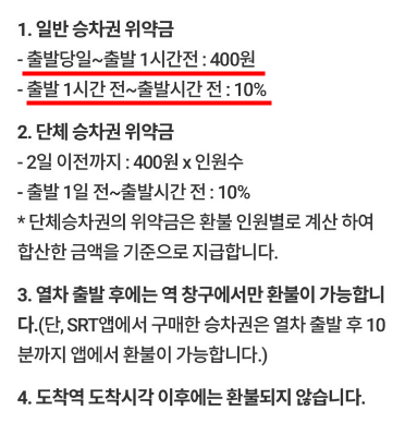 보통 어떤 티켓이나 표를 중간에 취소하게 되면 위약금이나 수수료 등을 떼서 손해를 보는게 일반적인데요. SRT는 당일 취소가 아니라면 위약금이 아예 없고, 설령 당일날 급하게 취소한다 하더라도 출발 1시간 전에만 취소한다면 위약금이 400원 뿐이라 부담도 없습니다.