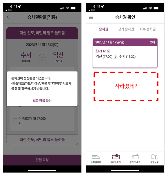 조금 전까지만 해도 2개의 승차권이 있었는데 방금 취소한 1개가 사라진 것을 확인할 수 있습니다. 이로서 환불처리가 모두 끝난 것입니다.