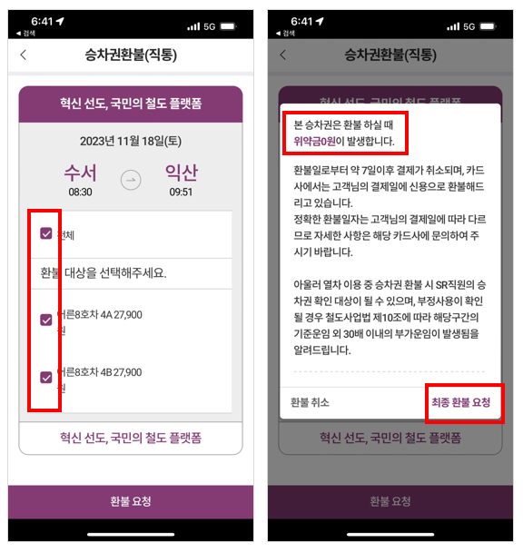 안내 얼럿을 확인했다면 그 다음으로 환불할 티켓을 선택합니다. 저는 예매한 열차표 모두 취소할 것이었기에 전체를 체크하고 하단에 [환불요청] 버튼을 누릅니다.