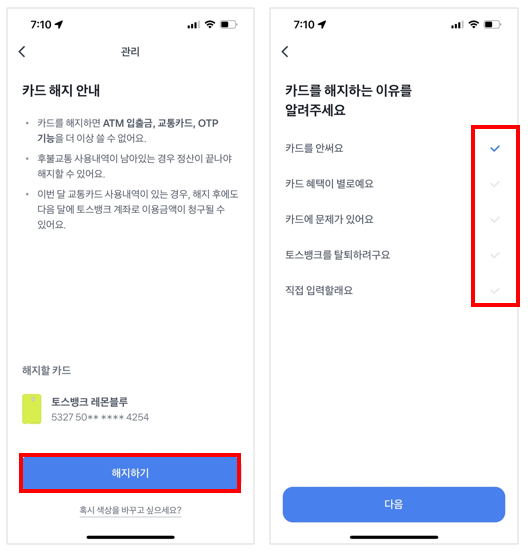 해지 메뉴로 들어가면 보유중인 카드 중 어떤걸 해지할지 선택하여 해지를 진행할 수 있습니다. 맨 마지막에는 카드 해지 사유에 대해 묻는 설문이 있는데 가벼운 마음으로 체크해주면 됩니다.