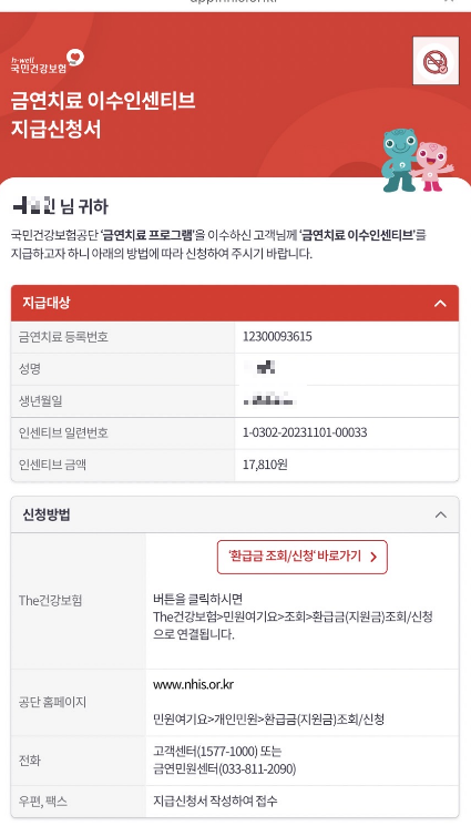 저는 꽤 오래전에 이수한 금연치료에 대해서 환급기간이 지나 못 받을 줄 알았는데 여전히 받을 수 있다는게 좀 신기했습니다. 3만원 조금 넘는 돈이지만 이렇게나마 돌려받을 수 있어서 기분은 좋네요.