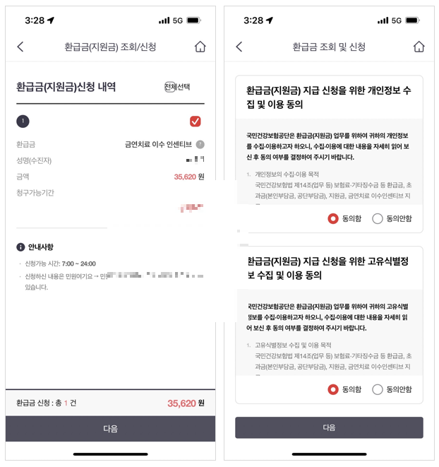 저는 금연치료 이수 인센티브로 총 35,620원을 청구할 수 있는 것으로 나오는데요. 환급금 신청을 위해 일단 몇가지 이용 동의 절차를 거칩니다.