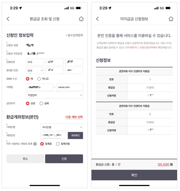 환급받을 계좌정보를 함께 입력해줘야 하는데, 이 때 신청자의 명의와 계좌명의가 일치해야만 유효합니다.
