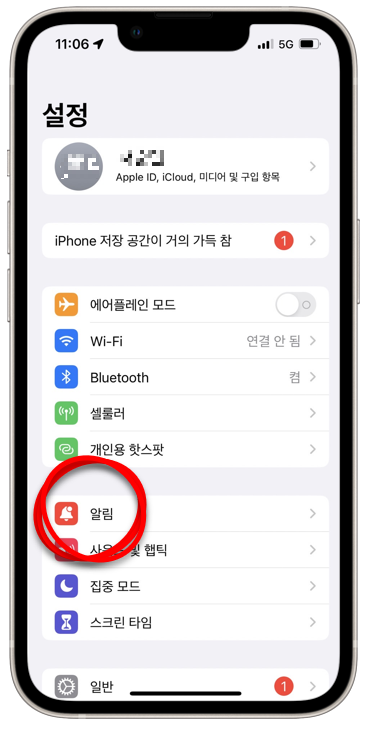 그렇게 설정 메뉴에 들어가면 화면 중간에 '알림' 이라는 메뉴가 보이는데 이걸 누릅니다.