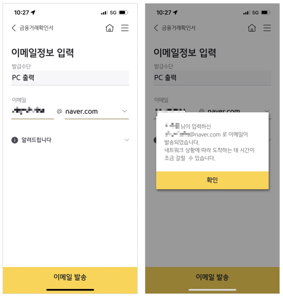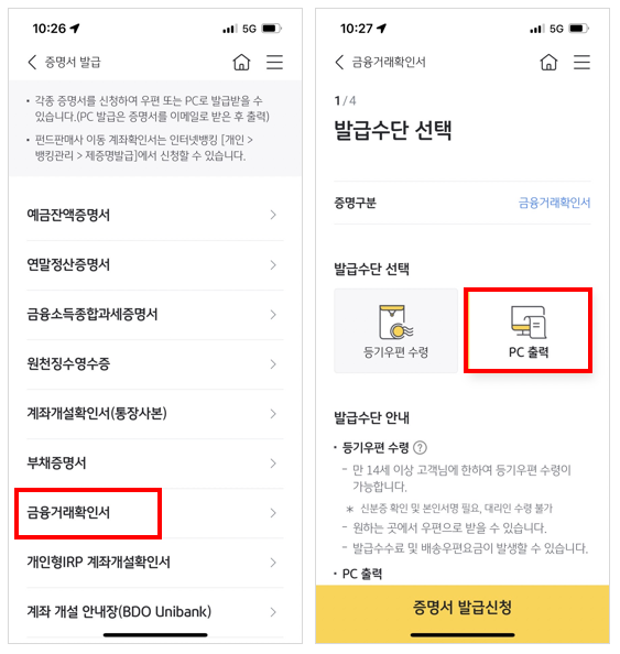 다만 한가지 유념하셔야 할 점은 KB스타뱅킹 앱에서 쉽게 발급 신청을 할 수는 있으나 어차피 출력을 해야한다면 PC를 이용해야 합니다. 그렇기에 애초에 KB국민은행 인터넷뱅킹으로 발급신청을 해도 좋고, 그게 아니라면 저처럼 KB스타뱅킹 앱으로 일단 발급 신청만 해두셔도 좋습니다.