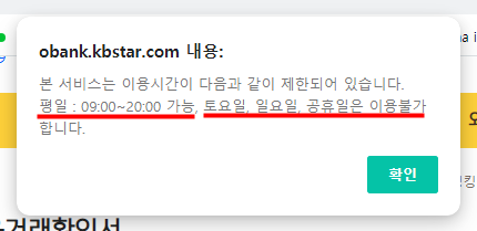 저는 밤 10시가 넘은 시간에 시도했다가 아래 얼럿을 보고 다음날 아침까지 기다려야 했습니다. 괜한 헛수고 하지 않도록 반드시 이 부분 참고하셔야 합니다.