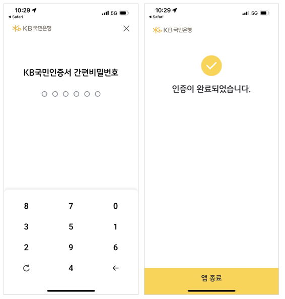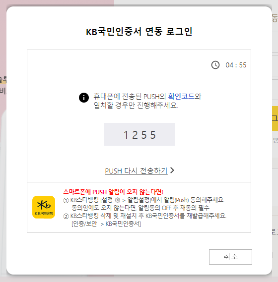 공동인증서로 로그인할 수도 있고, KB국민인증서로도 로그인 할 수 있습니다. 저는 KB국민인증서 로그인을 선택했고, 아래 화면처럼 확인코드가 노출된 후 스마트폰 스타뱅킹 앱에서 push 알림을 수신하게 됩니다.