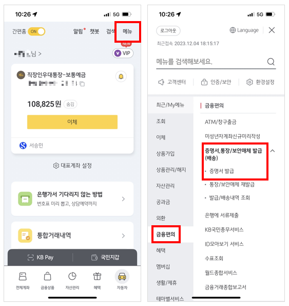KB스타뱅킹 앱에서 금융거래확인서 발급 신청하기