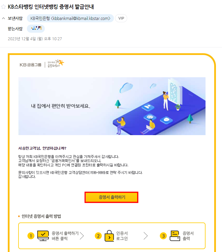 메일함을 보니 아래와 같이 'KB스타뱅킹 인터넷뱅킹 증명서 발급안내' 라는 메일이 와있습니다. 메일을 열람하고 본문에 [증명서 출력하기] 버튼을 클릭하합니다. 여기서부터는 PC 환경에서 진행하는 것을 추천드립니다.