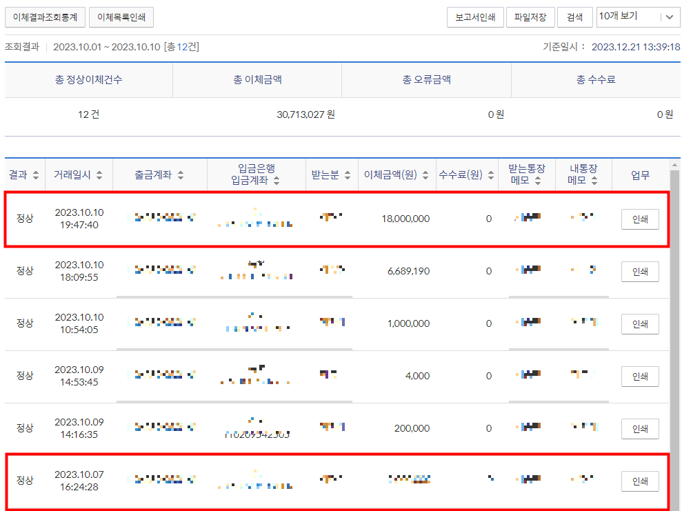 이제 이체영수증 출력을 위해 목록의 맨 우측에 [인쇄] 버튼을 클릭합니다.