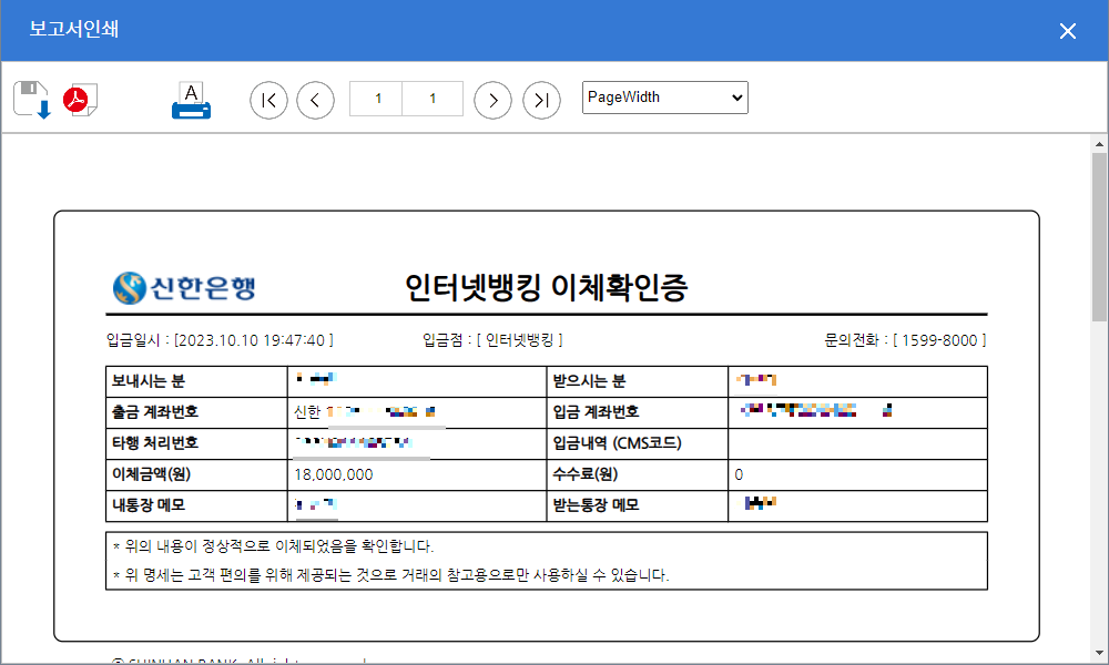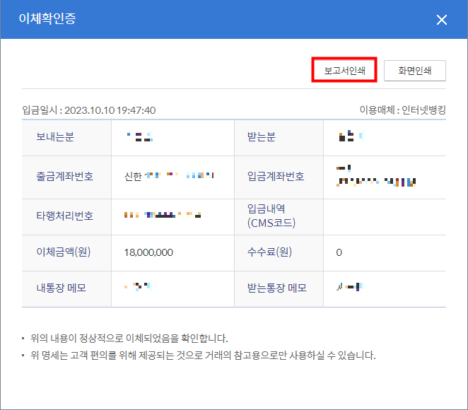 [인쇄] 버튼을 누르면 이체확인증이 팝업으로 뜨고 거기에 [보고서인쇄]를 클릭합니다.