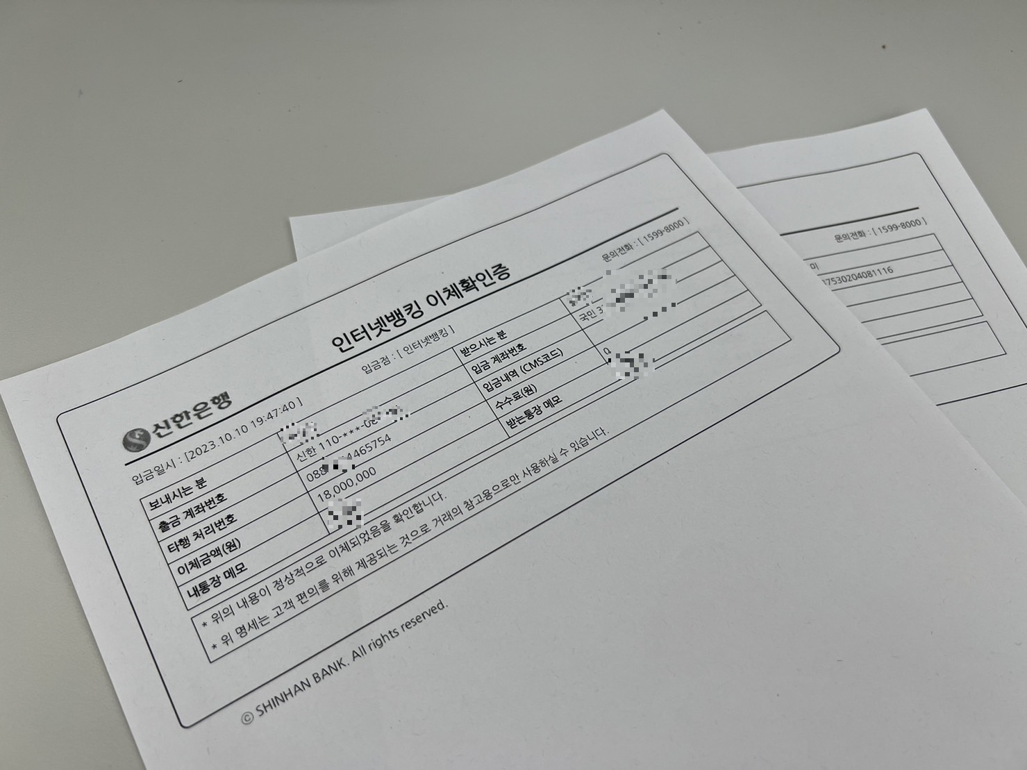저는 이 인쇄한 이체영수증 및 입금영수증을 종이로 출력했고, 사진을 찍어 은행에 제출했습니다.