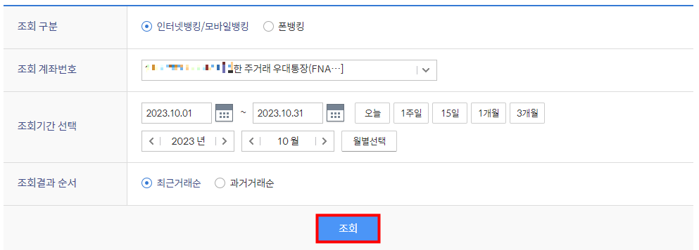그 다음 화면에서 조회할 계좌번호를 선택하고, 조회기간을 선택합니다.
