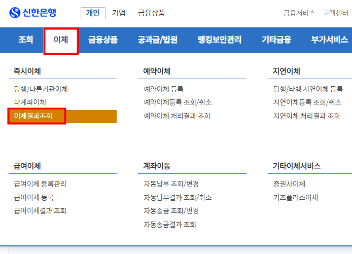 신한은행 인터넷뱅킹 홈페이지 상단 메뉴에서 이체>이체결과조회 메뉴로 들어갑니다.