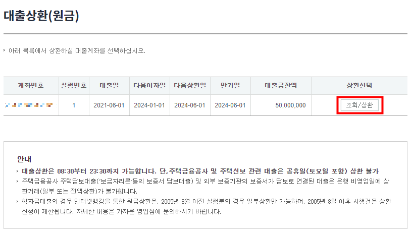 맨 우측에 있는 [조회/상환] 버튼을 클릭해 다음으로 진행합니다.