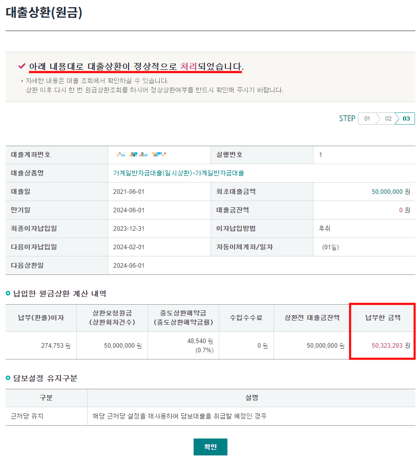 상환이 정상적으로 처리되면 아래와 같은 화면이 나옵니다.