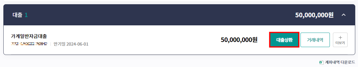 전체 계좌 리스트 중 아래와 같이 대출에 내가 받은 대출상품이 나타나는 것을 볼 수 있습니다.