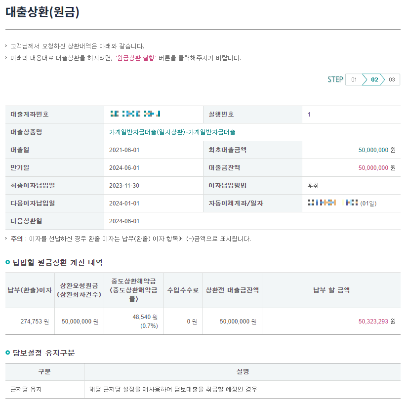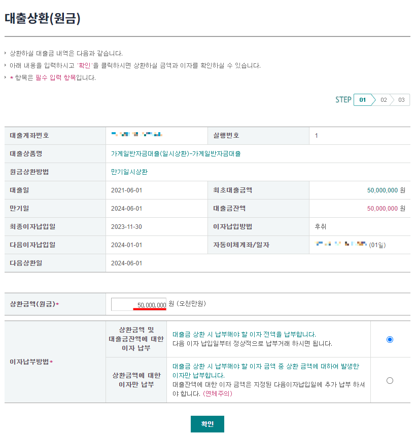 일부 상환이 아니라 모두 상환하는 것이기에 이자납부방법은 상환금액 및 대출금잔액에 대한 이자 납부를 선택해 이자까지 모조리 갚아버리기로 했습니다.